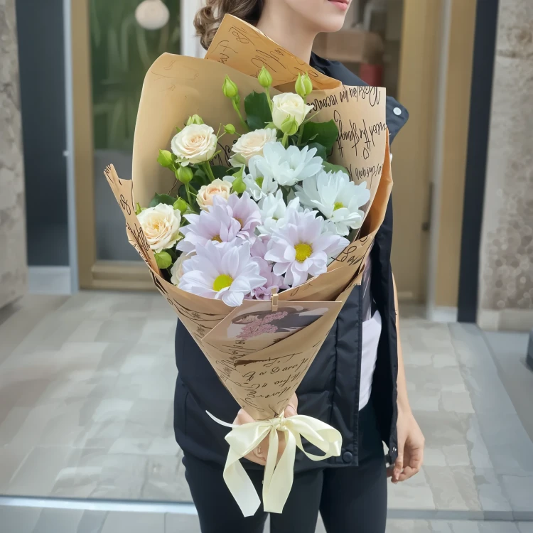 Изящный букет, объединяющий в себе бархатные поцелуи нежных кустовых роз и прекрасное танго кустовых хризантем. Каждый цветок внимательно подобран и аккуратно собран вручную, создавая неповторимое впечатление. Пленительные оттенки розовых и кремовых тоналей этих цветов создают мягкую атмосферу, наполняя комнату нежным ароматом и вниманием.