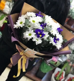 Этот удивительный букет – настоящая симфония красок и ароматов. В нем сочетаются нежные кустовые хризантемы, символизирующие долговечность и верность, и изящные ирисы, воплощающие в себе таинственность и чистоту. Каждый цветок, будто нота в мелодии, приносит свою уникальную гармонию композицию. Зелень, окружающая цветы, словно ласковое прикосновение природы, придает букету особую свежесть и живость. Крафтовая упаковка придает элегантности, подчеркивает эстетику этого букета и добавляет ему неповторимого шарма.